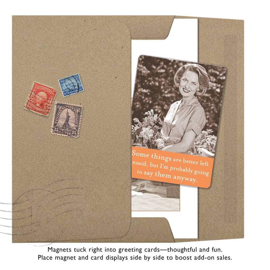 Vintage photography and plenty of personality – these slim, sturdy magnets add charm to fridges, file cabinets, and lockers, and slip easily into a card for a sweet surprise. Individually wrapped with a top tag for easy gifting.